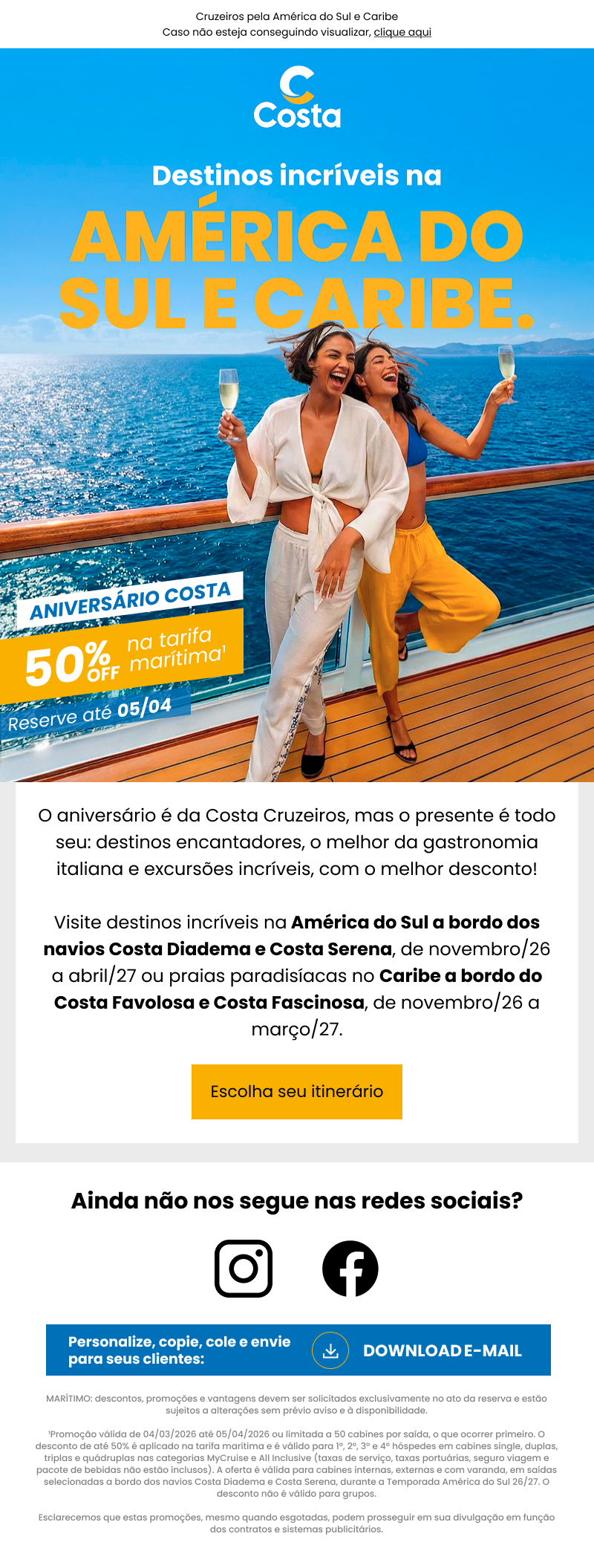 do Sul a bordo dos navios Costa Diadema e Costa Serena, de
