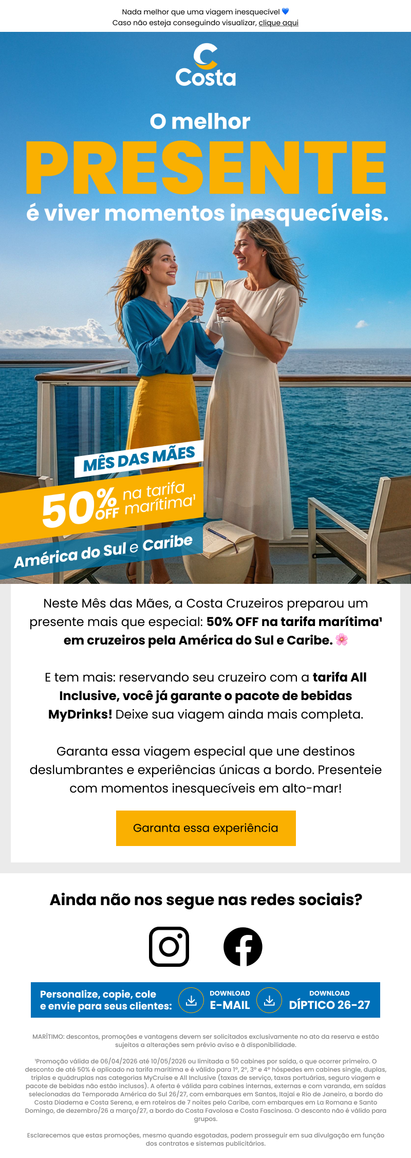 a bordo do Costa Favolosa e Costa Fascinosa. O desconto não é válido