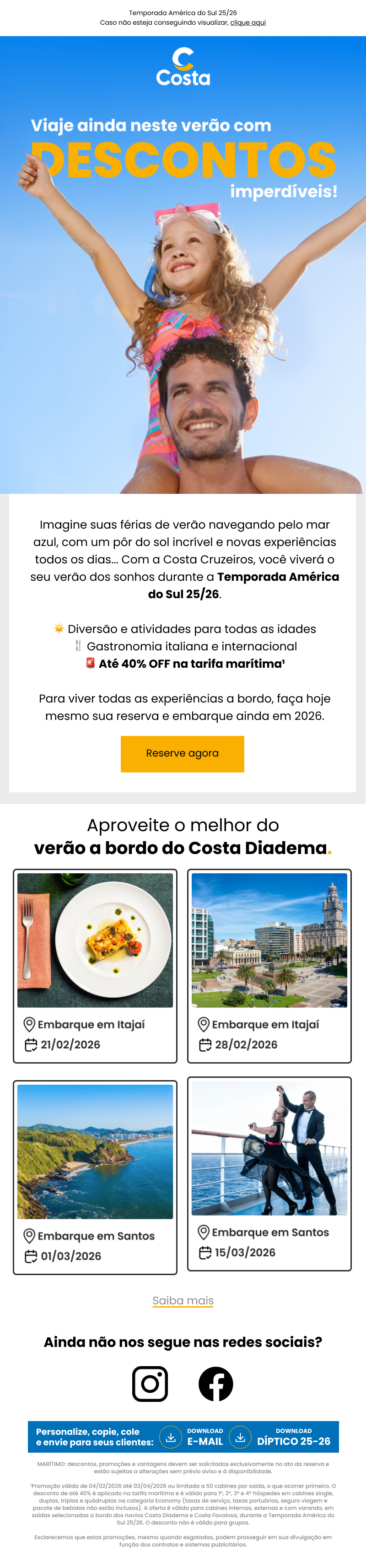 e Costa Favolosa, durante a Temporada América do Sul 25/26. O desconto