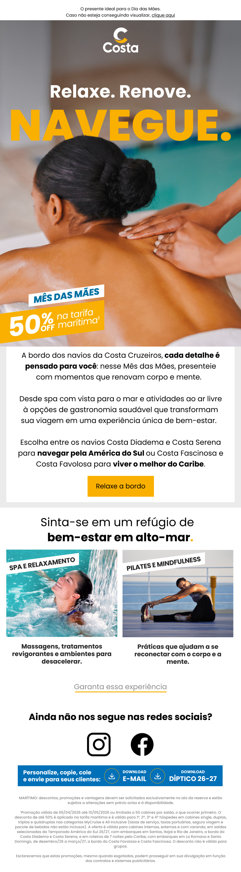 a bordo do Costa Favolosa e Costa Fascinosa. O desconto não é válido