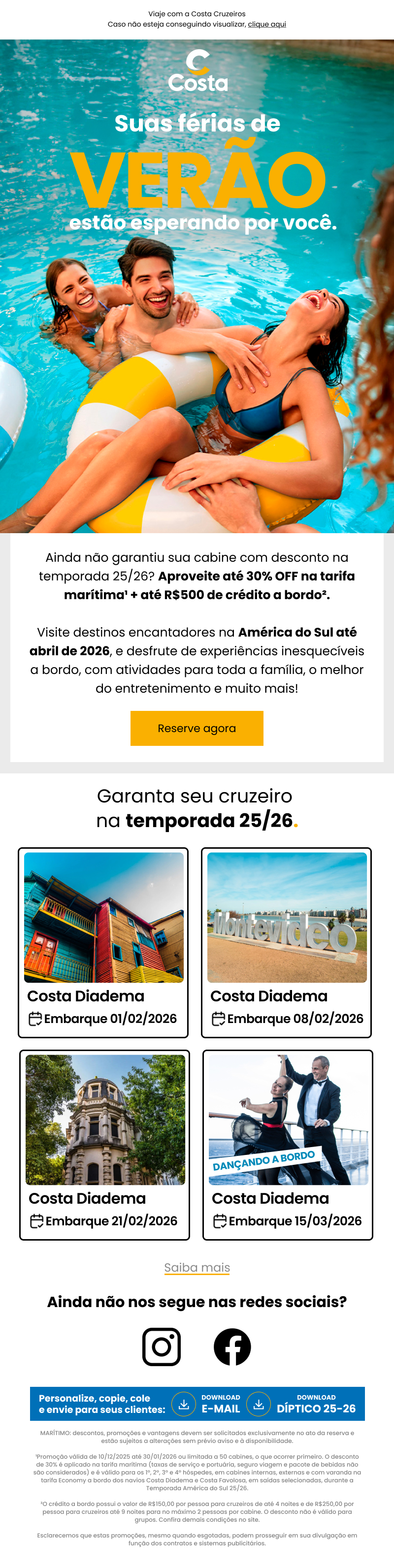com varanda na tarifa Economy a bordo dos navios Costa Diadema e Costa