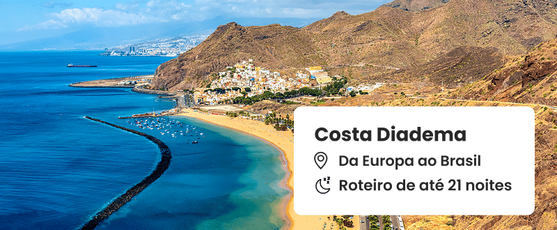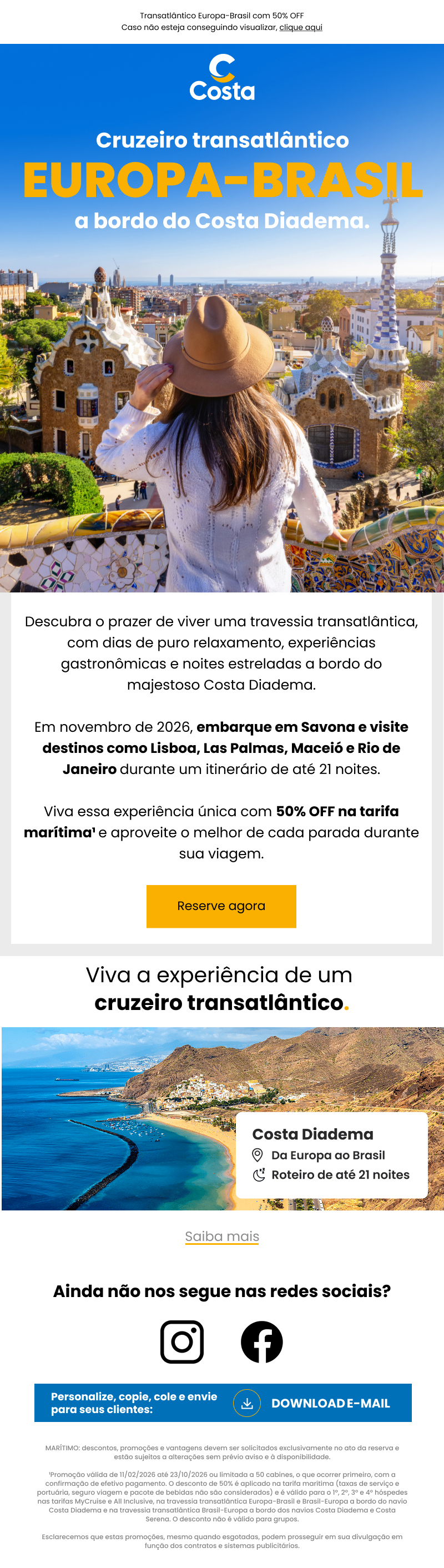 MARÍTIMO: descontos, promoções e vantagens devem ser solicitados exclusivamente no ato da reserva e estão sujeitos a alterações sem prévio aviso e à disponibilidade. ¹Promoção válida de 11/02/2026 até 23/10/2026 ou limitada a 50 cabines, o que ocorrer primeiro, com a confirmação de efetivo pagamento. O desconto de 50% é aplicado na tarifa marítima (taxas de serviço e portuária, seguro viagem e pacote de bebidas não são considerados) e é válido para o 1º, 2º, 3º e 4º hóspedes nas tarifas MyCruise e All Inclusive, na travessia transatlântica Europa-Brasil e Brasil-Europa a bordo do navio Costa Diadema e na travessia transatlântica Brasil-Europa a bordo dos navios Costa Diadema e Costa Serena. O desconto não é válido para grupos. Esclarecemos que estas promoções, mesmo quando esgotadas, podem prosseguir em sua divulgação em função dos contratos e sistemas publicitários. |