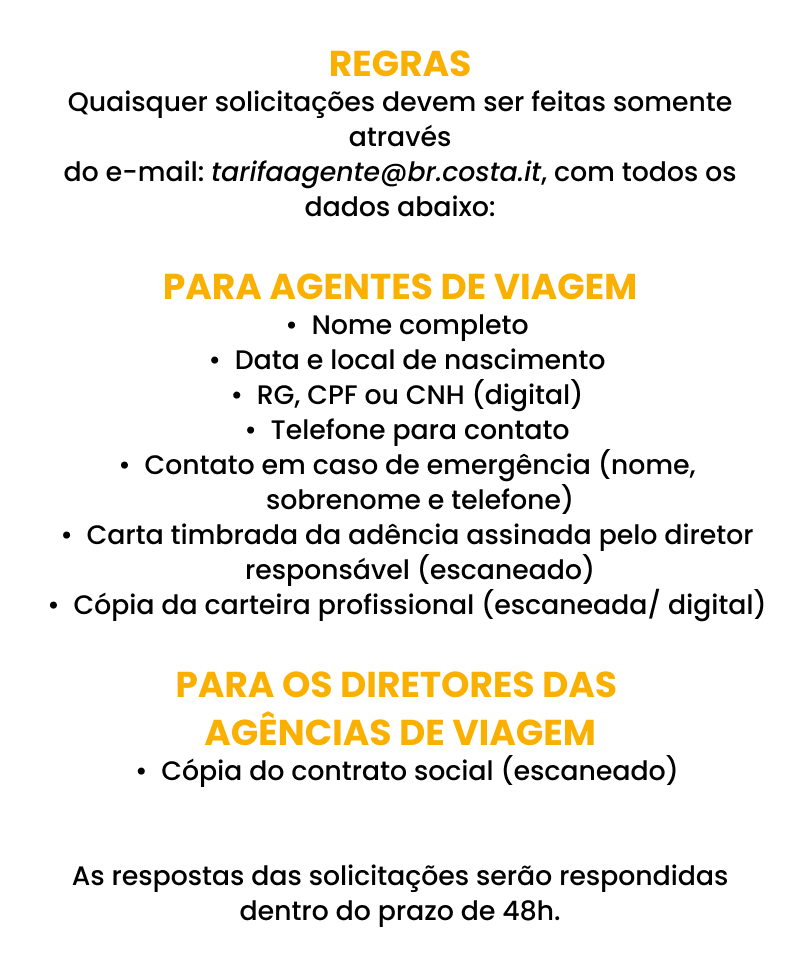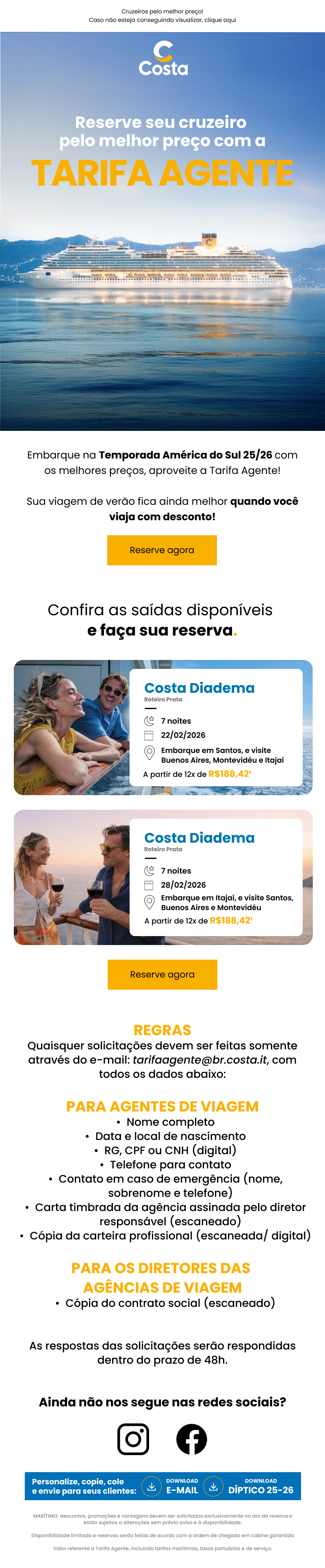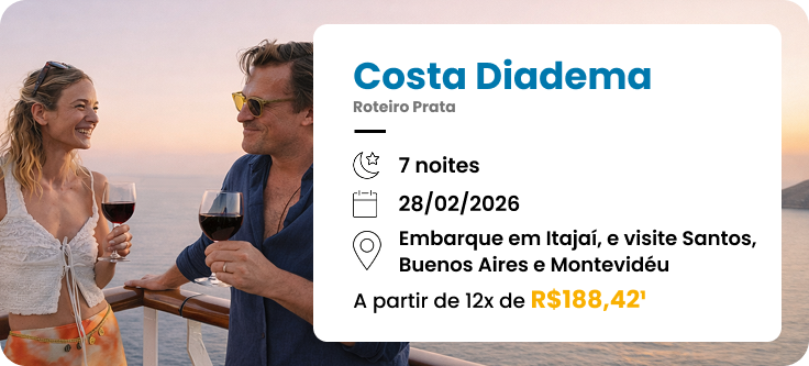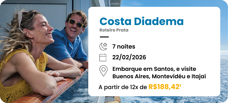 MARÍTIMO: descontos, promoções e vantagens devem ser solicitados exclusivamente no ato da reserva e estão sujeitos a alterações sem prévio aviso e à disponibilidade. Disponibilidade limitada e reservas serão feitas de acordo com a ordem de chegada em cabine garantida Valor referente a Tarifa Agente, incluindo tarifas marítimas, taxas portuárias e de serviço. |
