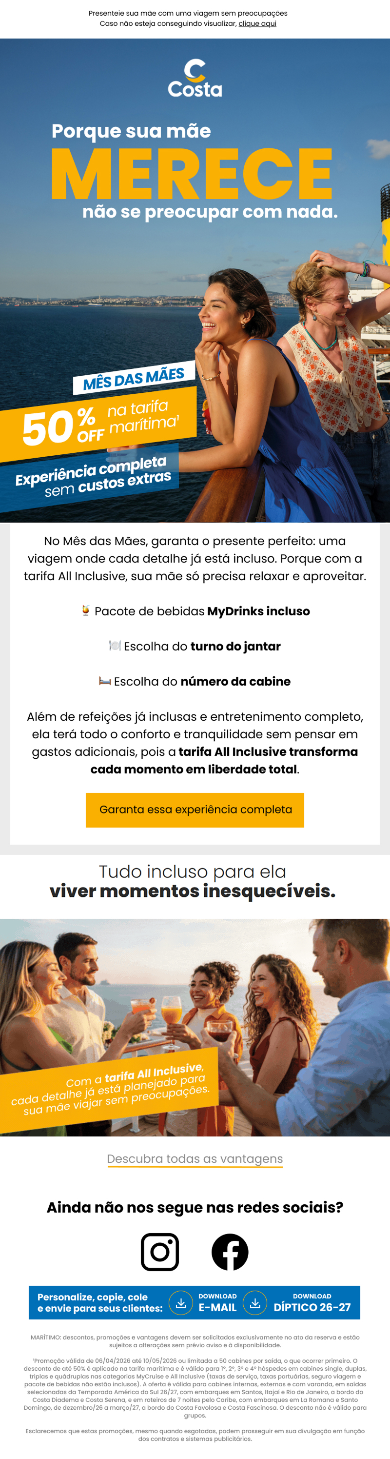 a bordo do Costa Favolosa e Costa Fascinosa. O desconto não é válido