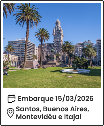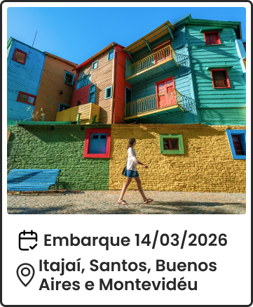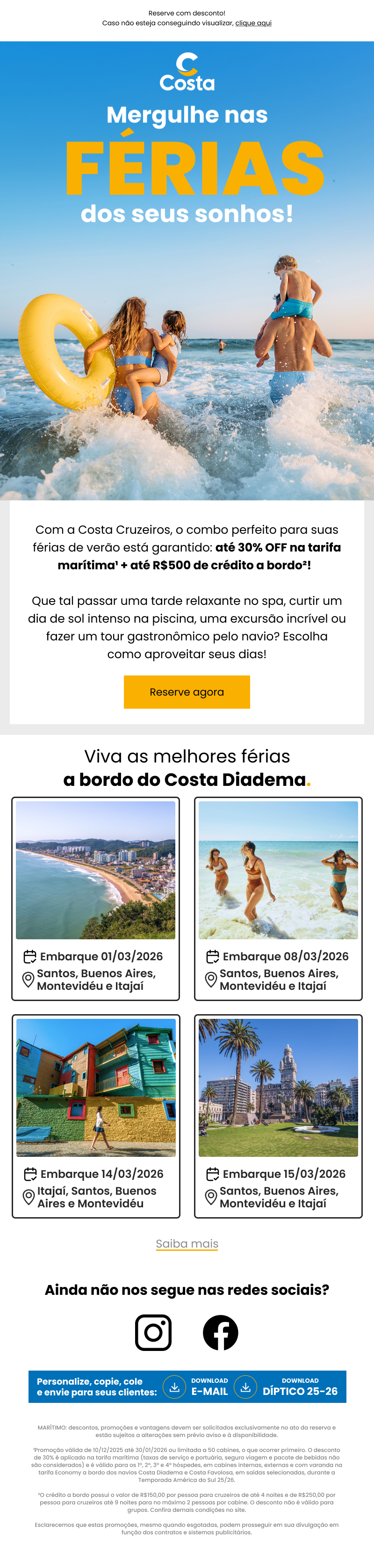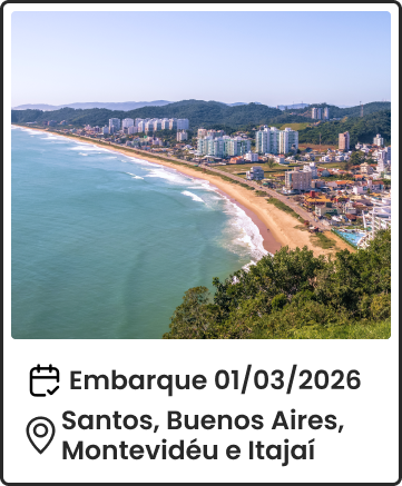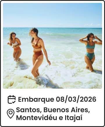 ¹Promoção válida de 10/12/2025 até 30/01/2026 ou limitada a 50 cabines, o que ocorrer primeiro. O desconto de 30% é aplicado na tarifa marítima (taxas de serviço e portuária, seguro viagem e pacote de bebidas não são considerados) e é válido para os 1º, 2º, 3º e 4º hóspedes, em cabines internas, externas e com varanda na tarifa Economy a bordo dos navios Costa Diadema e Costa Favolosa, em saídas selecionadas, durante a Temporada América do Sul 25/26.