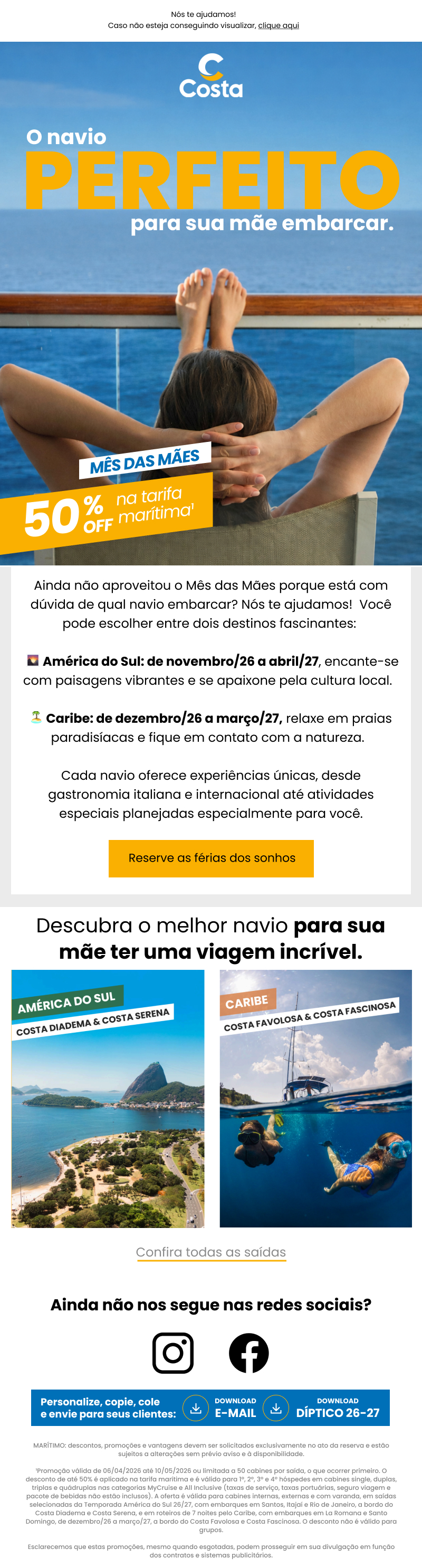 a bordo do Costa Diadema e Costa Serena, e em roteiros de 7 noites pelo