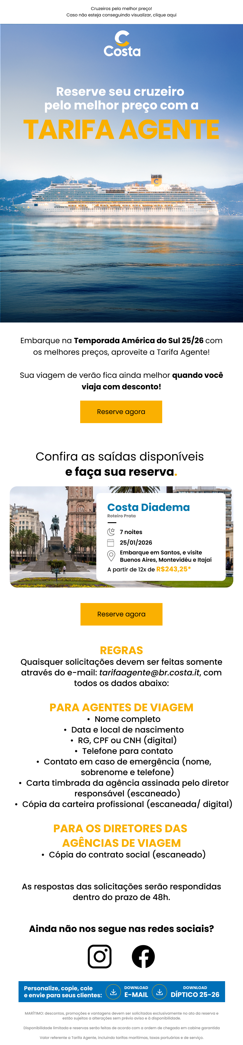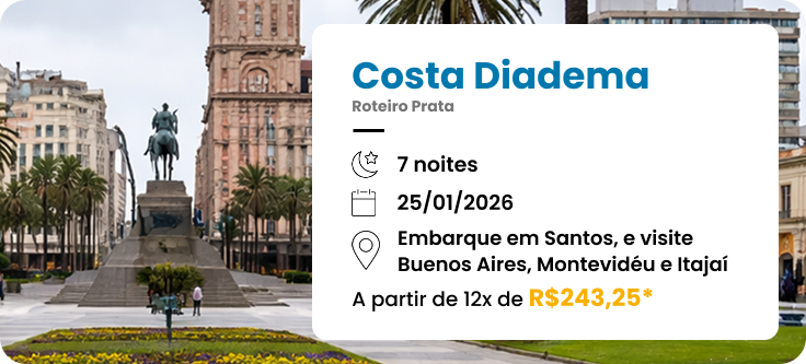 MARÍTIMO: descontos, promoções e vantagens devem ser solicitados exclusivamente no ato da reserva e estão sujeitos a alterações sem prévio aviso e à disponibilidade. Disponibilidade limitada e reservas serão feitas de acordo com a ordem de chegada em cabine garantida Valor referente a Tarifa Agente, incluindo tarifas marítimas, taxas portuárias e de serviço. |