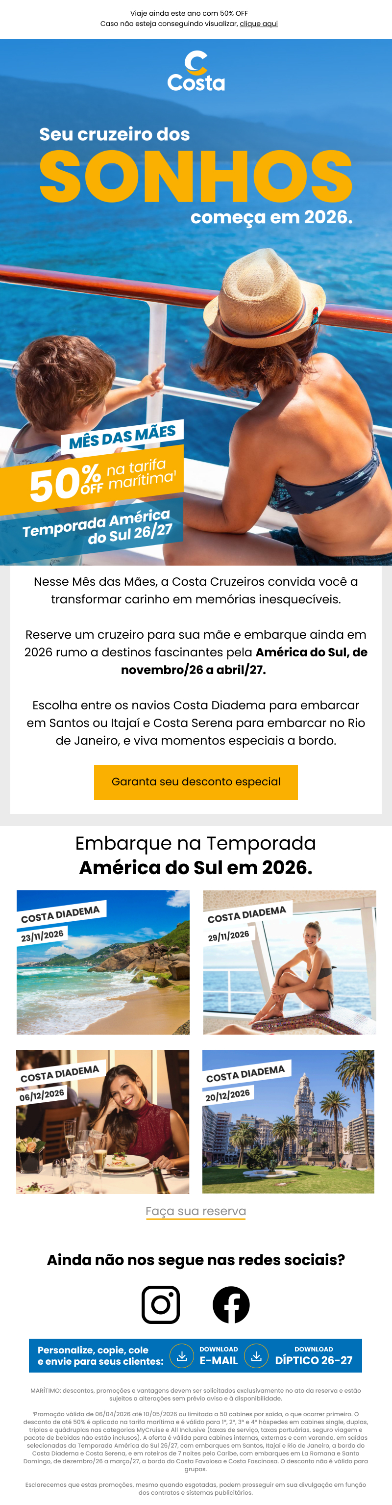 a bordo do Costa Diadema e Costa Serena, e em roteiros de 7 noites pelo