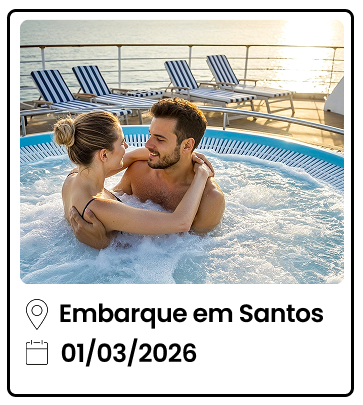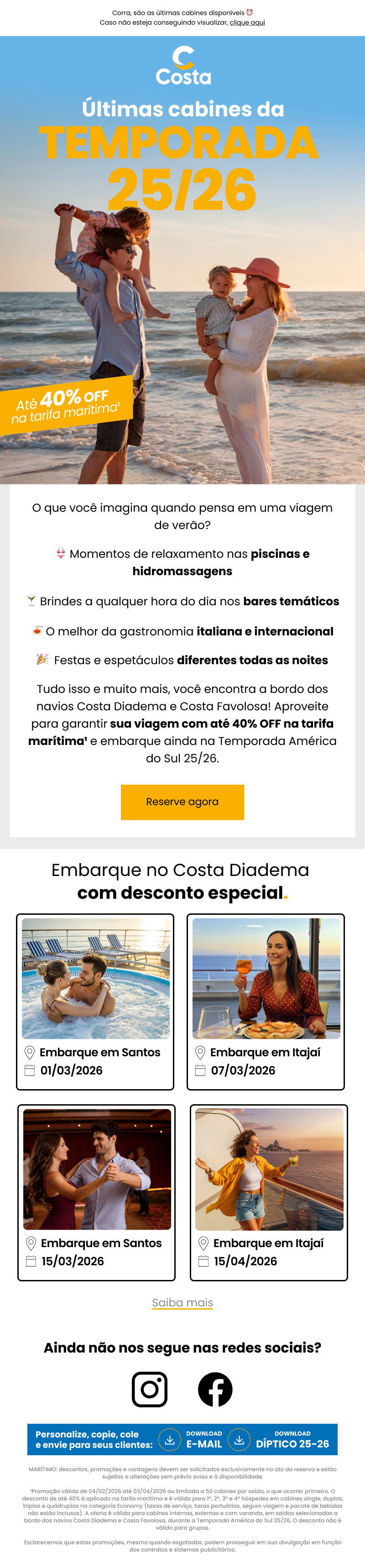 ¹Promoção válida de 04/02/2026 até 03/04/2026 ou limitada a 50 cabines por saída, o que ocorrer primeiro. O desconto de até 40% é aplicado na tarifa marítima e é válido para 1º, 2º, 3º e 4º hóspedes em cabines single, duplas, triplas e quádruplas na categoria Economy (taxas de serviço, taxas portuárias, seguro viagem e pacote de bebidas não estão inclusos). A oferta é válida para cabines internas, externas e com varanda, em saídas selecionadas a bordo dos navios Costa Diadema e Costa Favolosa, durante a Temporada América do Sul 25/26. O desconto não é válido para grupos.