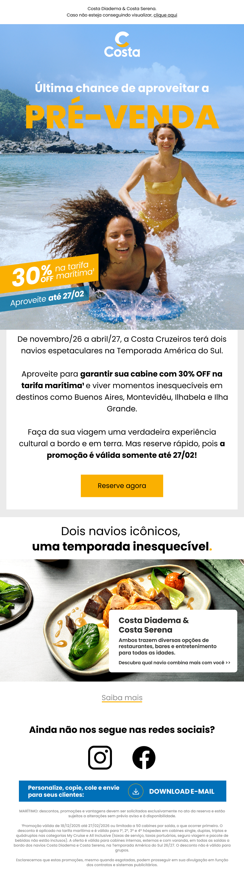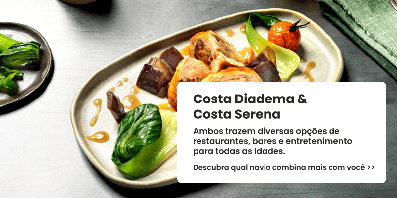 MARÍTIMO: descontos, promoções e vantagens devem ser solicitados exclusivamente no ato da reserva e estão sujeitos a alterações sem prévio aviso e à disponibilidade. ¹Promoção válida de 18/12/2025 até 27/02/2026 ou limitada a 50 cabines por saída, o que ocorrer primeiro. O desconto é aplicado na tarifa marítima e é válido para 1º, 2º, 3º e 4º hóspedes em cabines single, duplas, triplas e quádruplas nas categorias My Cruise e All Inclusive (taxas de serviço, taxas portuárias, seguro viagem e pacote de bebidas não estão inclusos). A oferta é válida para cabines internas, externas e com varanda, em todas as saídas a bordo dos navios Costa Diadema e Costa Serena, na Temporada América do Sul 26/27. O desconto não é válido para grupos. Esclarecemos que estas promoções, mesmo quando esgotadas, podem prosseguir em sua divulgação em função dos contratos e sistemas publicitários. |