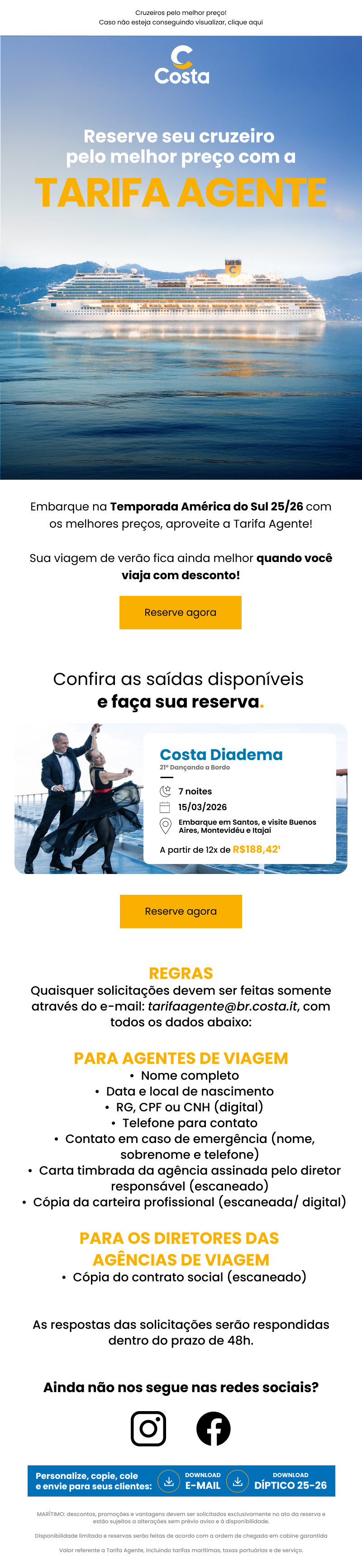 MARÍTIMO: descontos, promoções e vantagens devem ser solicitados exclusivamente no ato da reserva e estão sujeitos a alterações sem prévio aviso e à disponibilidade. Disponibilidade limitada e reservas serão feitas de acordo com a ordem de chegada em cabine garantida Valor referente a Tarifa Agente, incluindo tarifas marítimas, taxas portuárias e de serviço. |