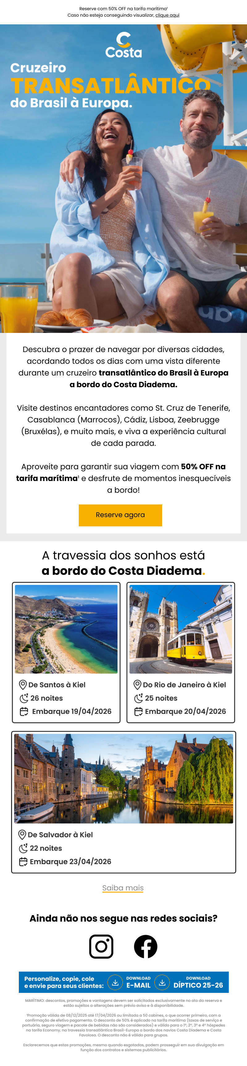 a bordo dos navios Costa Diadema e Costa Favolosa. O desconto não é